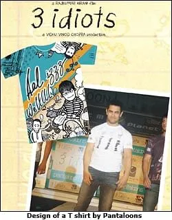 Future Group's Pantaloons India has collaborated with Vinod Chopra Films to launch the 3 Idiots apparel and accessories collection. In his spare time during the shooting of the film, Khan was in the habit of scribbling. The designers at Pantaloons were handed over the pages on which Khan scribbled and the designs were executed on T-shirts. Starting at Rs 399, the T shirts are available in 45 Pantaloons stores across the country.