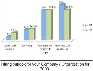 A survey conducted of 900+ recruiters across India by Naukri.com revealed a positive outlook for the year 2009. 44% predict addition of new jobs, 37.5% expect replacement hiring, 13.4% expect a freeze and 4.6% anticipate layoffs