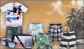 Bold purple butterfly prints and a Japanese floral garden print add retro glamour to off the shoulder beach dresses and swimwear. Classic striped and checked trunks add an element of versatility to the men's range where bright prints give a summery touch. Perfectly complementing the collection are shorts, tees and super chic sunglasses tempting you to head to the beach now!