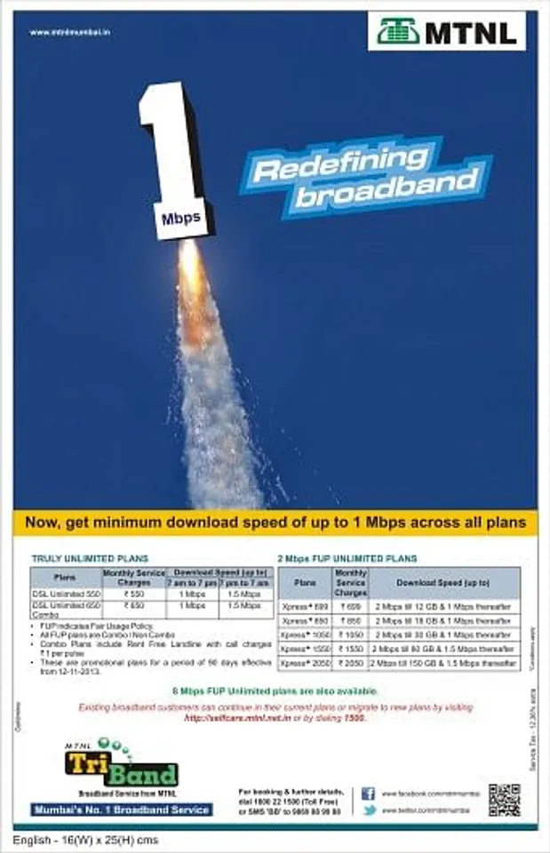 Brand : MTNL | Product Group : TriBand | Name of Agency : Goldmine Advertising Ltd | City of Agency : Mumbai | Country Of Agency : India | Client : MTNL | Work type : Client work | Date of publication / release : Dec 19, 2013 | Body copy :