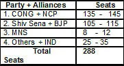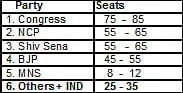 The editorial team of IBN LOKMAT, the number one Marathi news channel and India’s leading English news channel CNN-IBN has made a projection based on ground analysis of electoral trends in this multi-cornered election. Congress-NCP combined is projected to get between 135 and 145 seats in the 288 member assembly. In 2004 the combine had 142 seats (71–71). As per the projections, this time Congress is set to win between 75 and 85 seats and NCP between 55 and 65 seats.