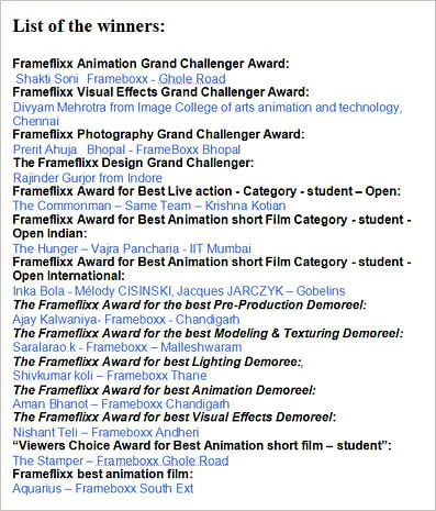 The various categories for the awards included the Frameflixx animation Grand Challenger Award for animation, visual effects, photography and design; the Frameflixx Award for Best Live action; Frameflixx awards for best visual effects; Frameflixx Award for Best Experimental Film; Frameflixx awards for Best Student Demoreel; the Frameflixx Platinum Achievers' Award for Contribution to Animation & Visual Effects Industry; Viewers Choice Award for Best Animation short film – student; Frameflixx Award for The Best Animation Film.