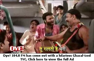 This is Oye! 104.8 FM’s second TVC release. The first TVC, also directed by Pradeep Sarkar, was based on the Khas Peshkash version of item number “Shiela ki Jawani”. The video of this commercial has gathered great response from listeners and has also found recognition in Bollywood. Shah Rukh Khan said “I love the part when the ghazal singer keeps singing Bhat’s my name and a lady from the crowd says ab bata bhi dijiye na”. Worth a watch if you have not seen it.