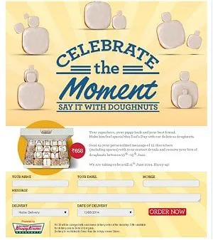 We have created a facebook app on Krispy Kreme India page to achieve this. Anyone who logs into the application is asked to enter a 15 character message and their address. These messages will be imprinted on the doughnuts. After online payment, Krispy Kreme will send this special pack of doughnuts to the address provided by the user. The orders will be delivered between 13th to 15th June. We hope that, by providing the customers reasons to connect with Krispy Kreme through this happy occasion, this social media campaign will generate high visibility for Krispy Kreme Doughnuts.