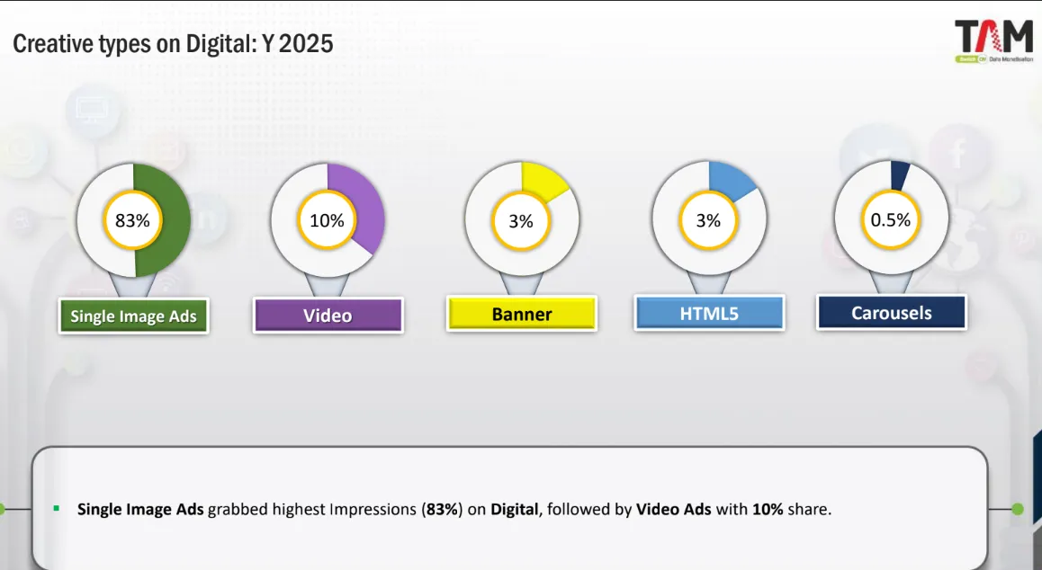 In terms of creative formats, single image ads dominated with an 83% share of digital impressions, followed by video ads at 10%, while banners, HTML5, and carousel formats made up the remainder.