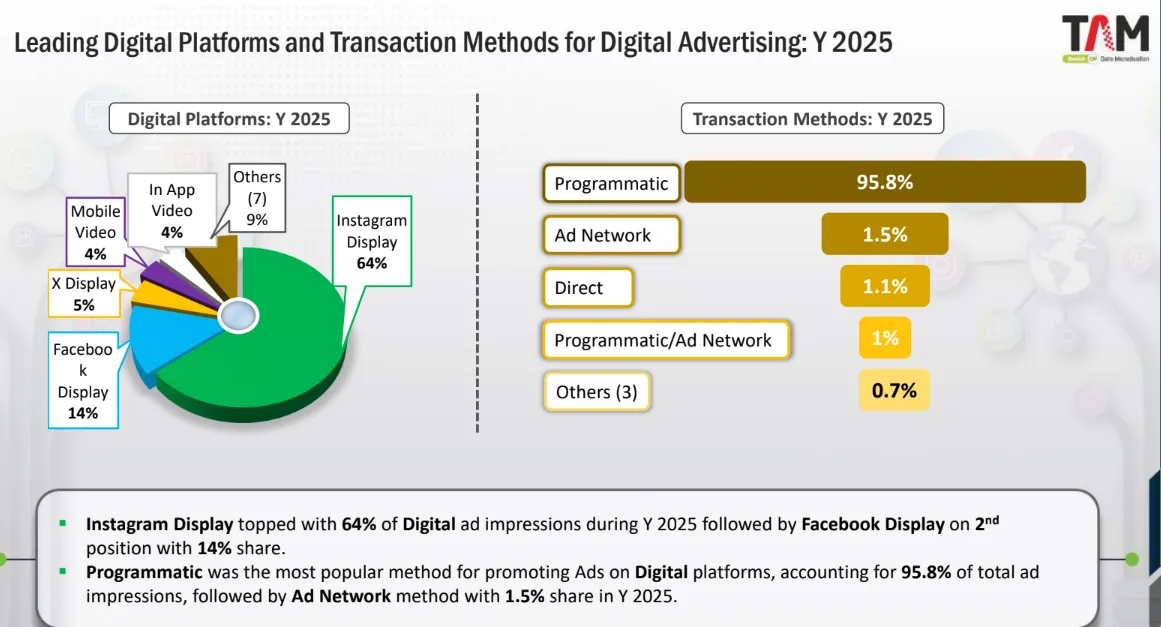 The report also highlights the overwhelming adoption of automated buying tools. Programmatic advertising accounted for 95.8% of total digital ad impressions, making it the most widely used transaction method for digital campaigns.